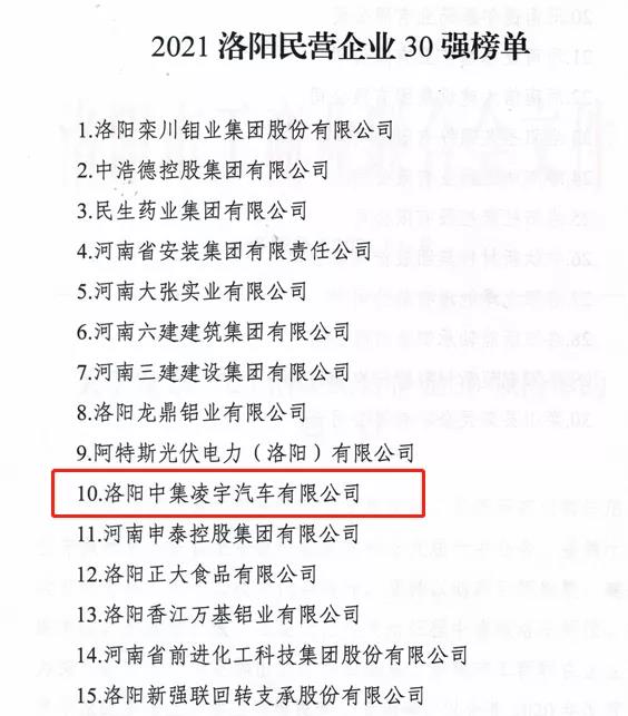 同期,由洛陽市工商聯(lián)主辦的“洛陽民營企業(yè)30強”發(fā)布會上,中集凌宇憑借穩(wěn)健的發(fā)展實力,位列“2021洛陽民營企業(yè)30強”第十位。